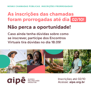 O prazo para as inscrições das chamadas da AIPÊ (Aliança pela Inclusão Produtiva) foi prorrogado até dia 02.10. Não perca a oportunidade de fortalecer e impulsionar o seu projeto.