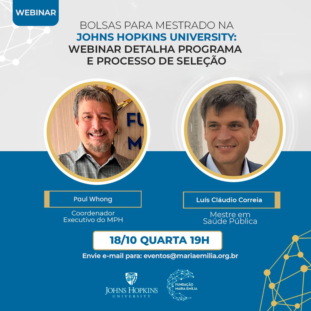 No dia 18/10, quarta-feira, às 19h, temos um encontro marcado. Se você atua ou já teve experiência em Saúde Pública, participe de um webinar para saber tudo sobre o edital, a ser lançado em breve, para o Master of Public Health (MPH) da Johns Hopkins Bloomberg School of Public Health, uma das melhores do mundo.