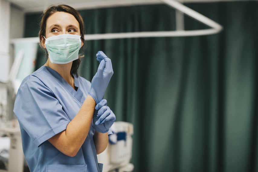 Female nurse with a mask putting on gloves preparing to cure coronavirus patient