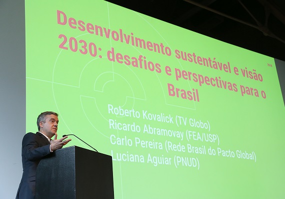 Carlo Pereira trouxe a experiência do Pacto Global, uma iniciativa lançada em 2000 e vinculada ao então secretário-executivo das Nações Unidas, Kofi Annan. O Pacto nasceu da necessidade de mobilizar a comunidade empresarial do mundo para a adoção de valores fundamentais e internacionalmente aceitos em suas práticas de negócios. As empresas estão trabalhando na Agenda 2030 não só pelas responsabilidades que têm mas também pela oportunidade de negócio que existe. Para se ter dimensão desse universo, se forem somadas as receitas das dez maiores empresas do mundo, o resultado é um valor maior do que os PIBs dos 180 países mais pobres. “Há 15 anos quando se falava em sustentabilidade, se falava de projeto. Hoje, se fala em negócio, se fala em desenvolvimento de portfólio. Hoje as empresas estão se reinventando, são modelos de negócio e estão pensando seu portfolio e pensando em sustentabilidade. Quem não pensou em mudança do clima há 10, 15 anos, hoje está contabilizando prejuízo”, disse Pereira.