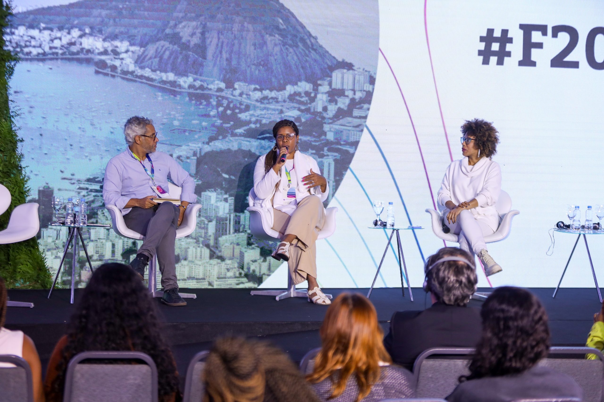 Cassio França, Secretário Geral do GIFE; Roberta Eugênio, Secretária Executiva do Ministério da Igualdade Racial, e Viviana Santiago, Diretora Executiva da Oxfam Brasil durante o Climate Solutions Forum.
