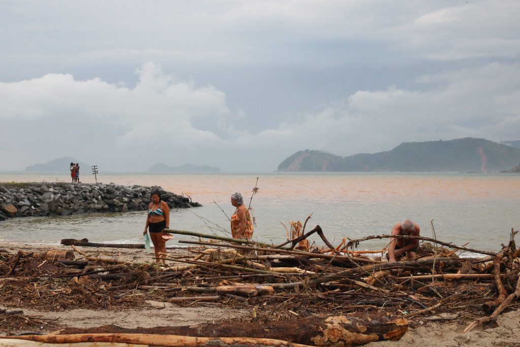 São Sebastião (SP), 21/02/2023, Troncos de árvores e água do mar barrenta na praia de Boiçucanga após enchentes e deslizamentos no litoral norte de São Paulo. Foto: Rovena Rosa/Agência Brasil