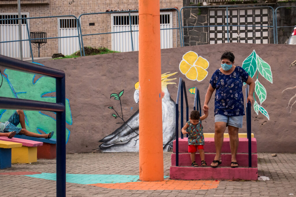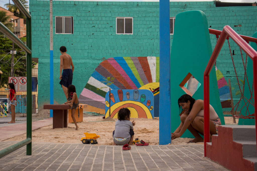 Cuidadores usufruem de espaços revitalizados em comunidades, juntos das crianças (Valeria Cristina da Silva/Prefeitura de Recife)