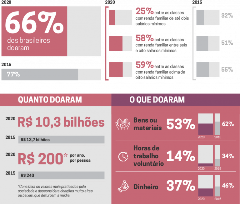 Foi possível notar, por exemplo, uma inversão, com as classes de maior poder aquisitivo doando mais do que os segmentos mais populares que, historicamente, são os que mais doam (Pesquisa Doação Brasil 2020). A causa que recebeu maior atenção dos recursos repassados também mudou: o combate à fome e à pobreza são prioridades, enquanto idosos e crianças ocupavam os primeiros lugares do ranking na edição de 2015 da pesquisa. Os doadores passaram a reconhecer mais o valor do seu gesto, tanto para o outro como para si mesmo, e a falar mais sobre o ato de doar.