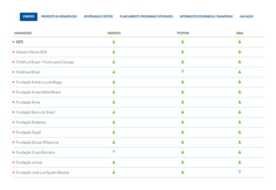 De acordo com a análise realizada, os indicadores mais divulgados foram principais programas, projetos, ações e atividades (98%); missão (90%); composição da equipe executiva (82%); endereço (82%); e telefone (80%). Alguns indicadores tiveram uma maior evolução desde a coleta inicial, como, por exemplo, a divulgação dos relatórios de atividades, que passou de 46% para 75%, os estatutos, que saltaram de 15% para 43%, assim como os relatórios de auditores independentes, passando de 34% para 57%.