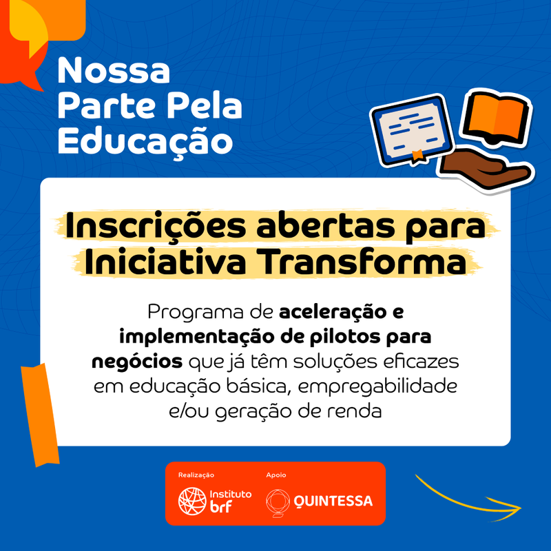 O Instituto BRF, em parceria com o Quintessa, tem uma oportunidade incrível para apoiar startups voltadas à educação! Conheça o Programa Nossa Parte pela Educação.
