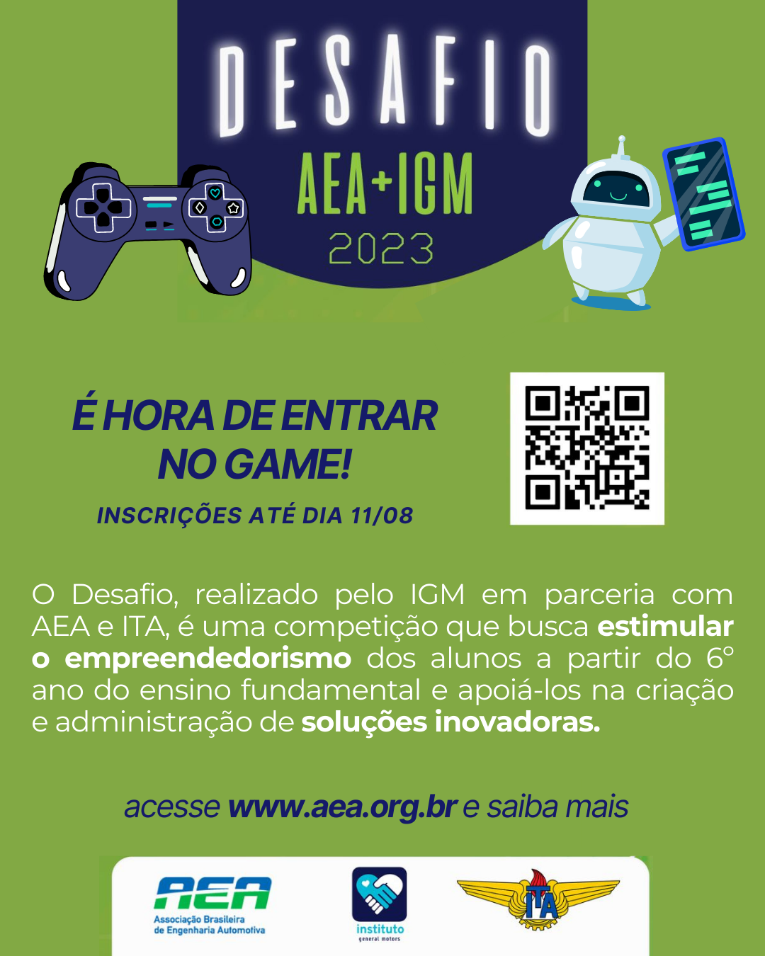 Realizado pelo IGM, em parceria com a Associação Brasileira de Engenharia Automotiva (AEA) e o Instituto Tecnológico de Aeronáutica (ITA), o Desafio visa estimular a cultura do empreendedorismo e inovação nas redes municipais e estaduais de educação, oferecendo aos adolescentes a oportunidade de transformar suas ideias em negócios. Apoiados por especialistas da indústria, eles passarão por uma trilha de desenvolvimento até a avaliação final, quando serão conhecidas as seis iniciativas vencedoras da competição, contempladas com os prêmios e mentorias do Centro de Competência em Manufatura (CCM) do ITA.