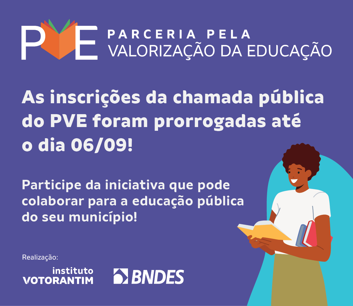 O Instituto Votorantim e o BNDES (Banco Nacional de Desenvolvimento Econômico e Social) prorrogaram o período de inscrições no programa Parceria pela Valorização da Educação (PVE). Agora, os municípios terão até o dia 6 de setembro para se candidatar através do site: https://selecaopve.institutovotorantim.org.br/.