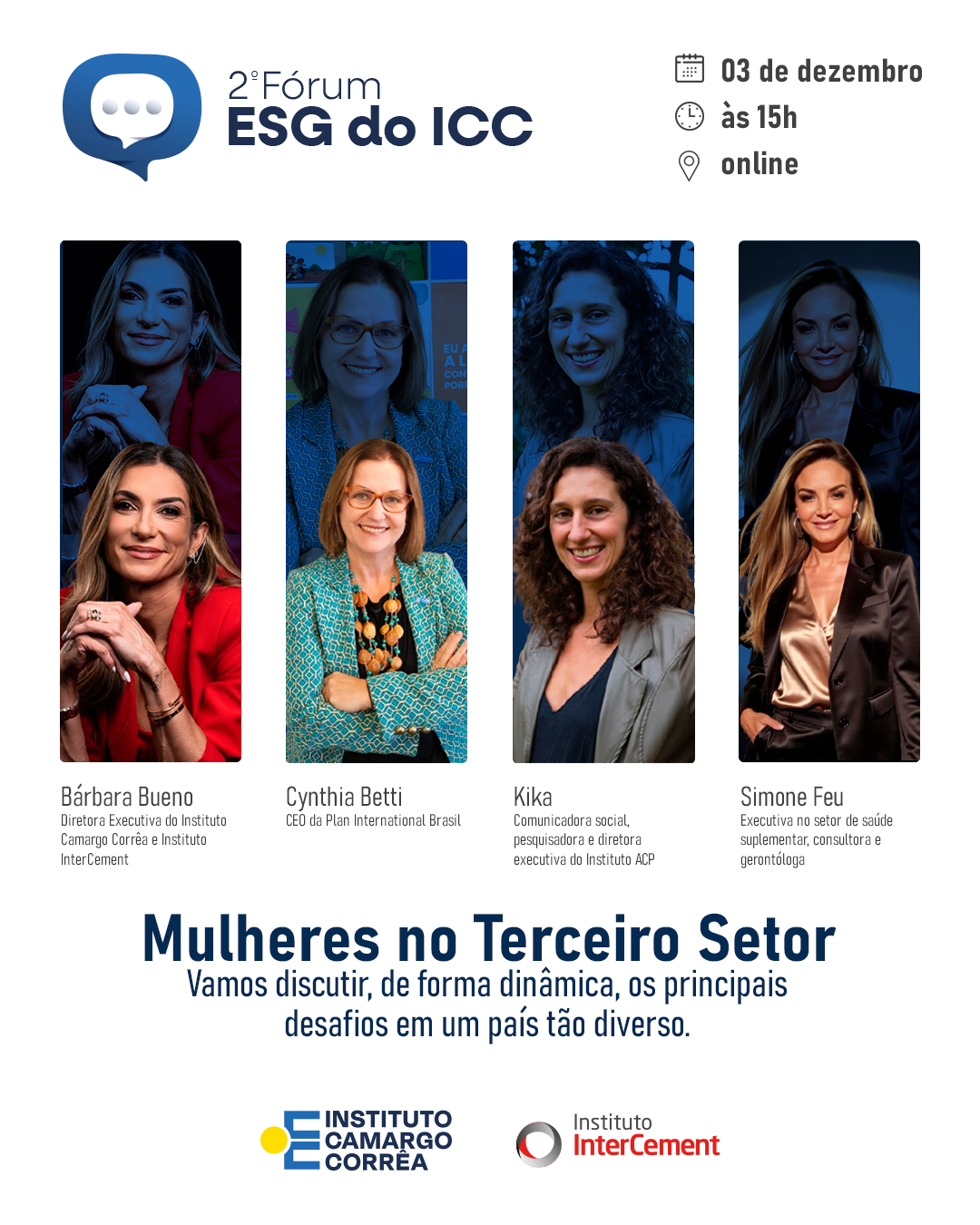 A segunda edição do evento reunirá três lideranças que atuam em diferentes frentes do Terceiro Setor: Cynthia Betti, CEO da Plan International Brasil; Kika Silva, comunicadora social, pesquisadora e diretora executiva do Instituto ACP; e Simone Feu, executiva no setor de saúde suplementar, consultora e gerontóloga. A mediação será conduzida por Bárbara Bueno, diretora executiva do Instituto Camargo Corrêa e do Instituto InterCement Brasil.