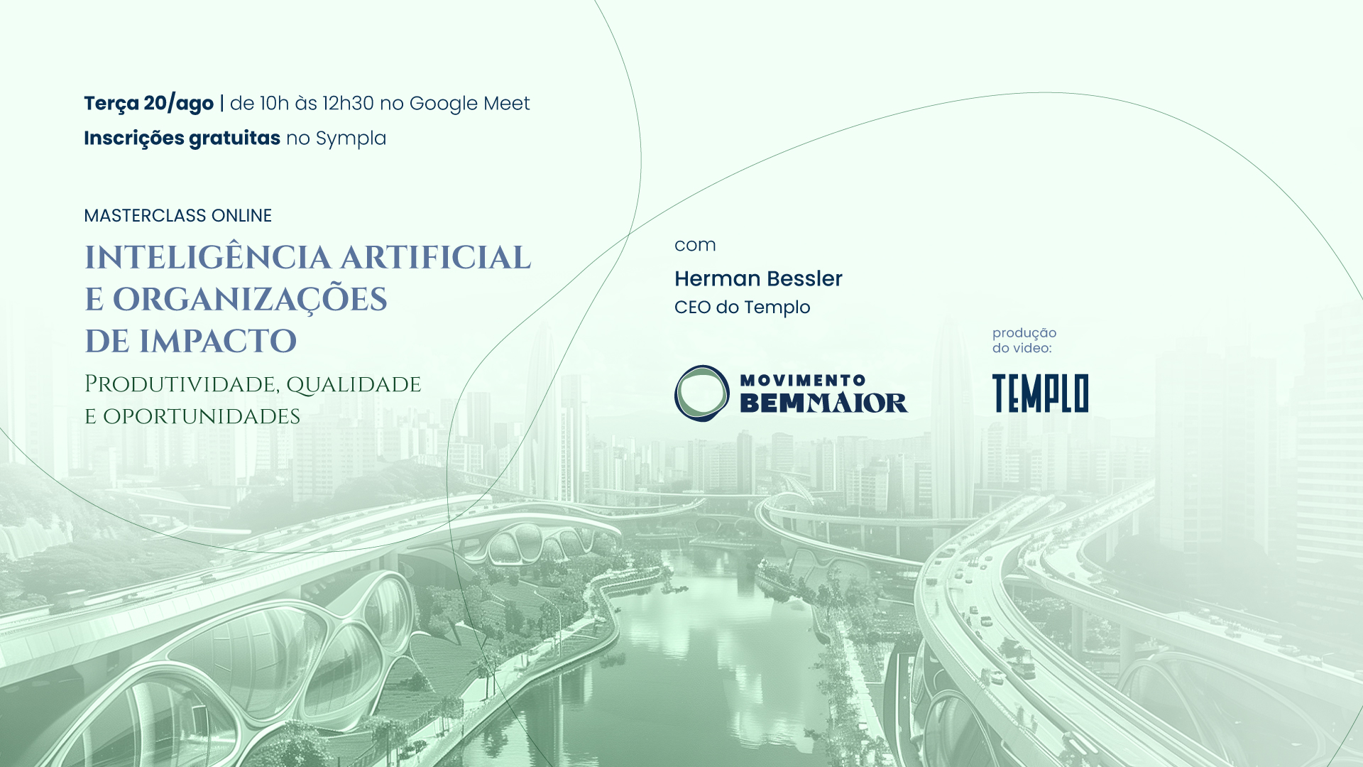 Para celebrar os 5 anos do Movimento Bem Maior e fortalecer o futuro do setor, a organização oferece gratuitamente a masterclass online: “Inteligência Artificial e Organizações de Impacto: Produtividade, Qualidade e Oportunidades”, com Herman Bessler, CEO e fundador do Templo. A masterclass acontece no dia 20 de agosto de 2024, das 10h às 12h30 (horário de Brasília), via Google Meet. Inscrições pelo Sympla.