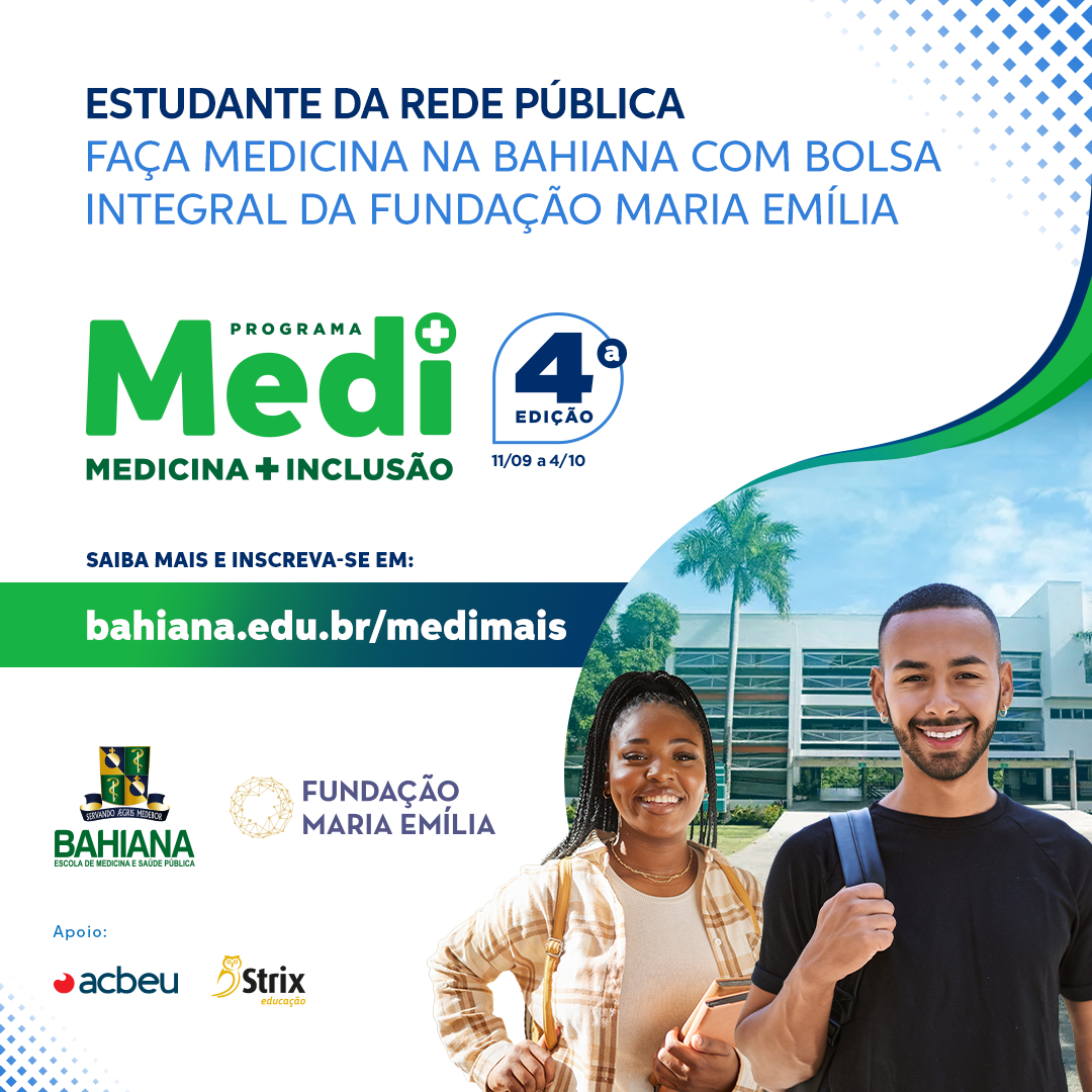 Estão abertas as inscrições para a 4ª edição do Programa Medi+, uma parceria entre a Fundação Maria Emília (FME) e a Escola Bahiana de Medicina e Saúde Pública (EBMSP). O programa foi criado para proporcionar a estudantes de baixa renda, egressos(as) de escolas públicas, a oportunidade de ingressar no curso de Medicina com bolsas integrais, oferecendo o suporte necessário até a formatura.