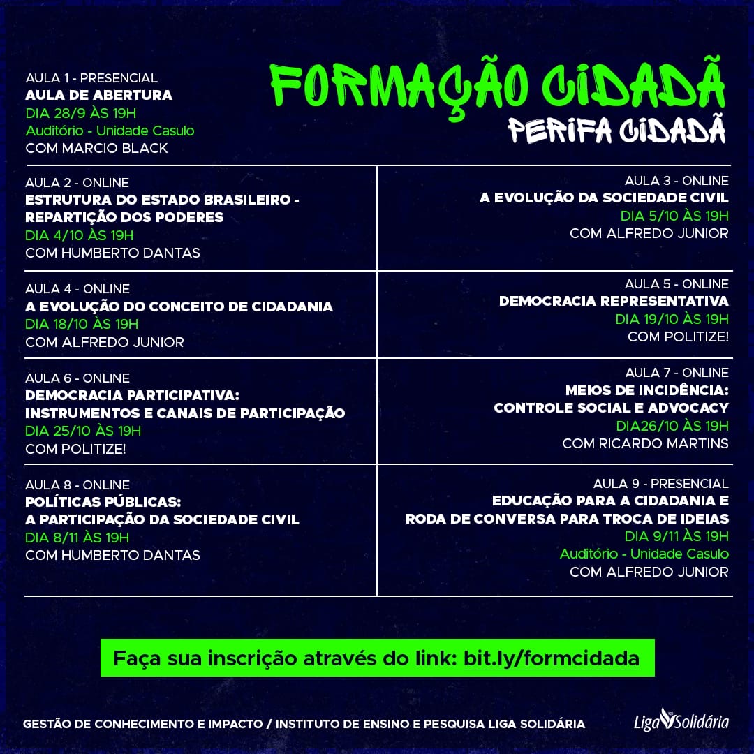 A Liga Solidária promove protagonismo e desenvolve formações na pauta da Democracia. Por meio do Instituto de Ensino e Pesquisa da Liga Solidária, o projeto Perifa Cidadã tem como objetivo despertar o senso crítico e promover o fortalecimento da população e líderes comunitários para a mobilização de comunidades.