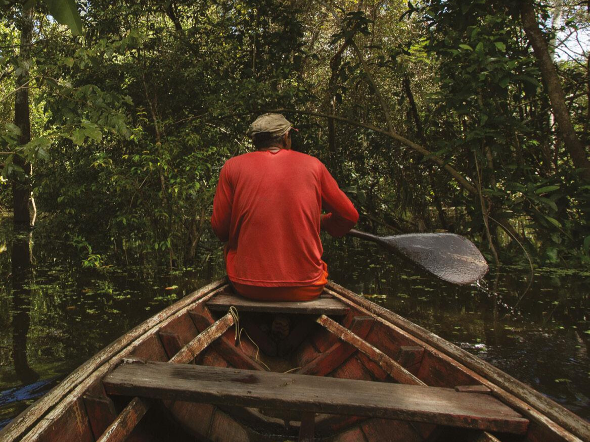 Ribeirinho é visto em sua canoa enquanto atravessa área de igapó no município de Careiro da Várzea, Amazonas © Bruno Kelly