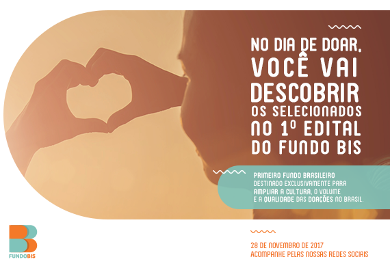 Os projetos selecionados pelo Fundo BIS, primeiro edital brasileiro destinado exclusivamente para ampliar a cultura, o volume e a qualidade das doações no Brasil, serão anunciados no Dia de Doar! Comemorado em 28 de novembro, o Dia de Doar é um movimento mundial de promoção da cultura de doação.